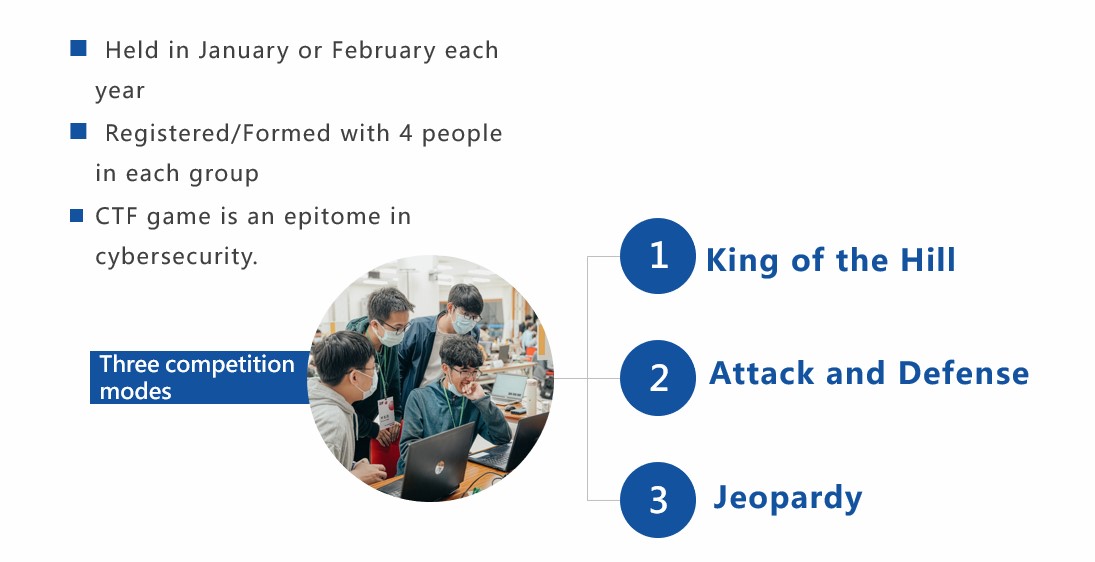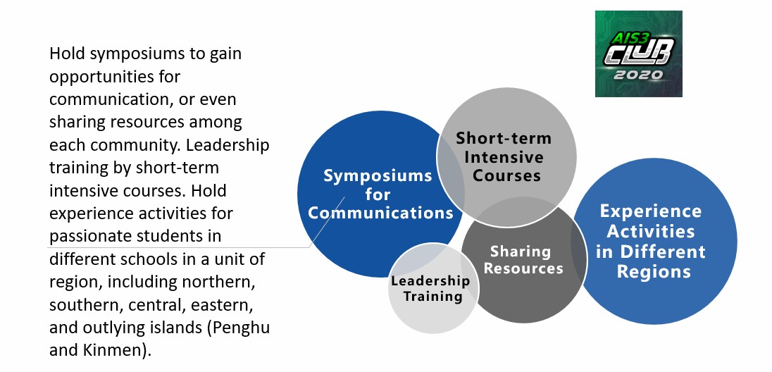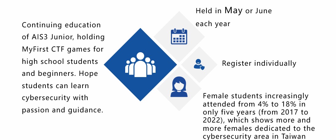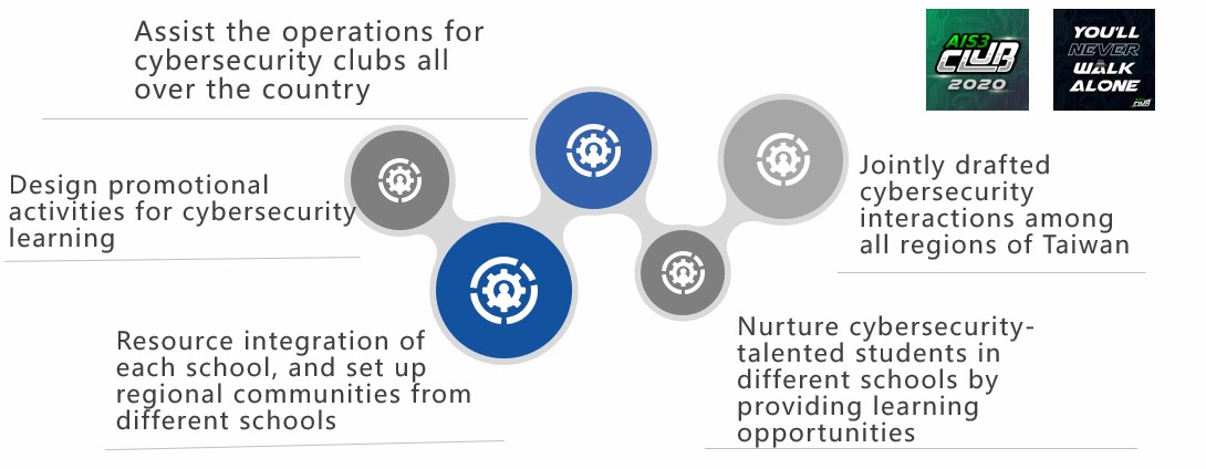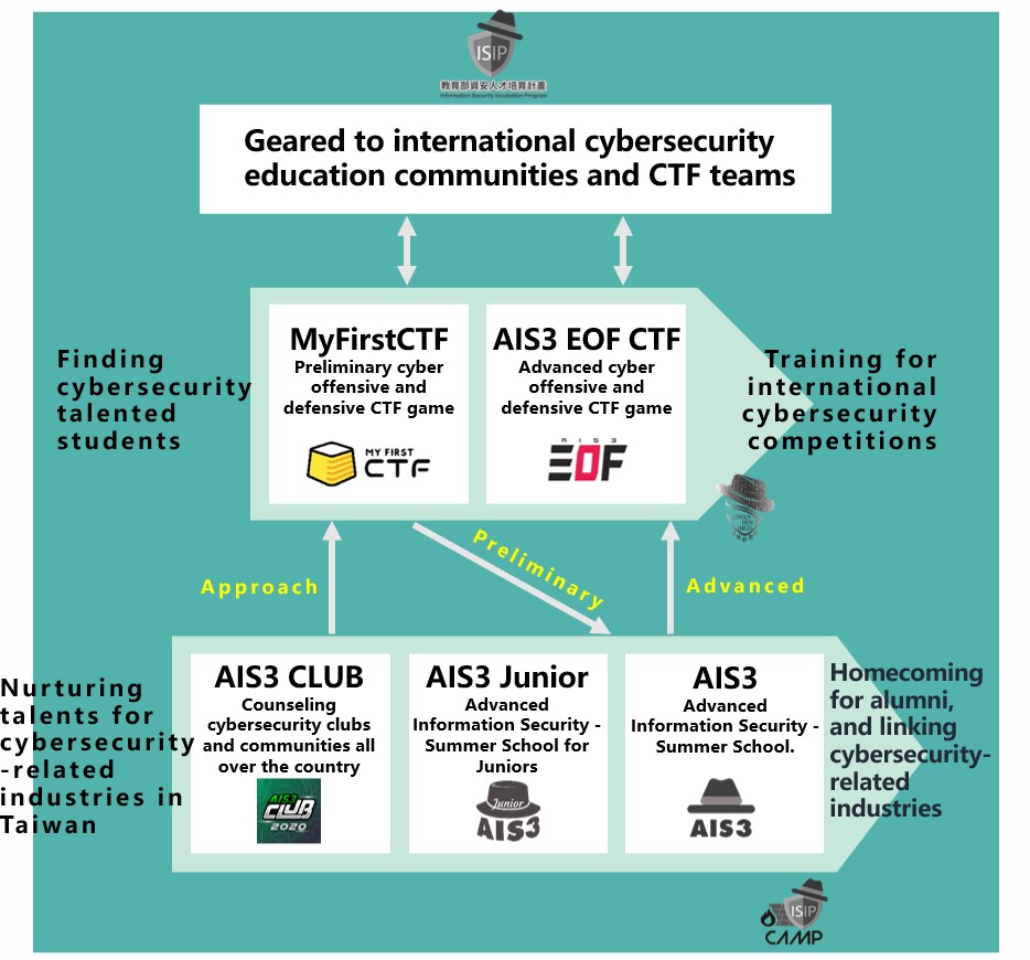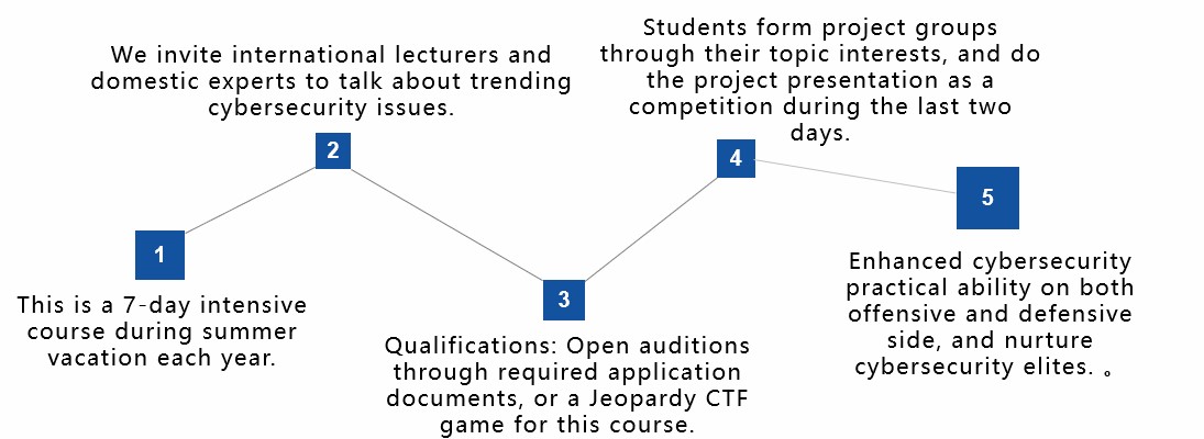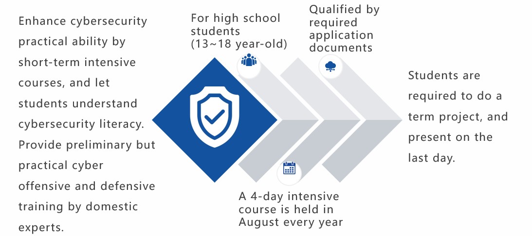 This is the most systematic and the largest scale cybersecurity training and education system in Taiwan. Counseling cybersecurity clubs in high schools and universities, which helps the mutual assistance and communication between these clubs. Training services in Red Team and Blue Team assessments to seek outstanding talents. Most importantly, we hold summer camps for senior high school students and college students. During this camp, we strengthen practical skills/experiences and cultivate cybersecurity competitors by connecting international lecturers and domestic experts.